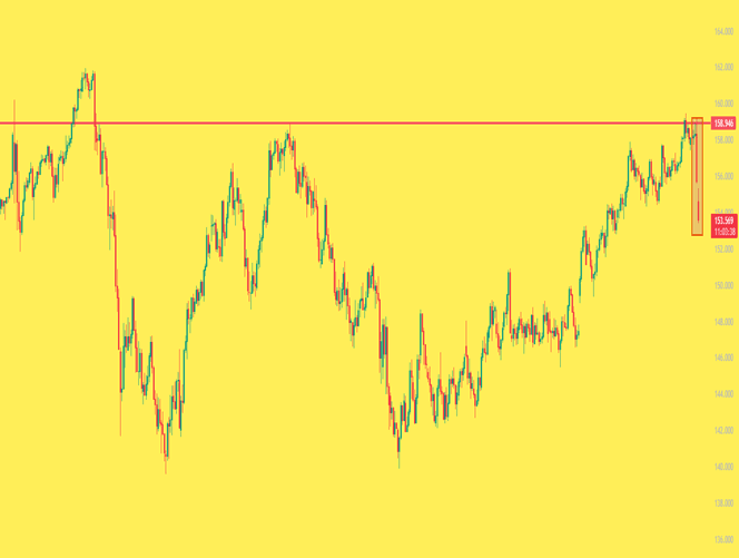 The pair dropped sharply after testing the highs from April 2024 and January 2025, confirming that bears are active above the $158 level.