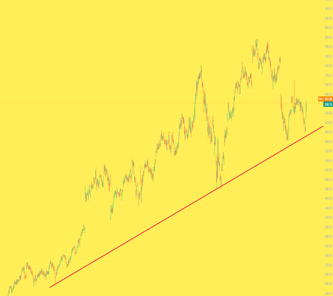 The stock is facing heavy selling pressure since the end of Q3 2025 but appears to have found support near the 600 level, which aligns with the upward sloping trendline. As long as it holds above this trend, the stock remains supported but a break below could trigger a sharp spike in volatility.
